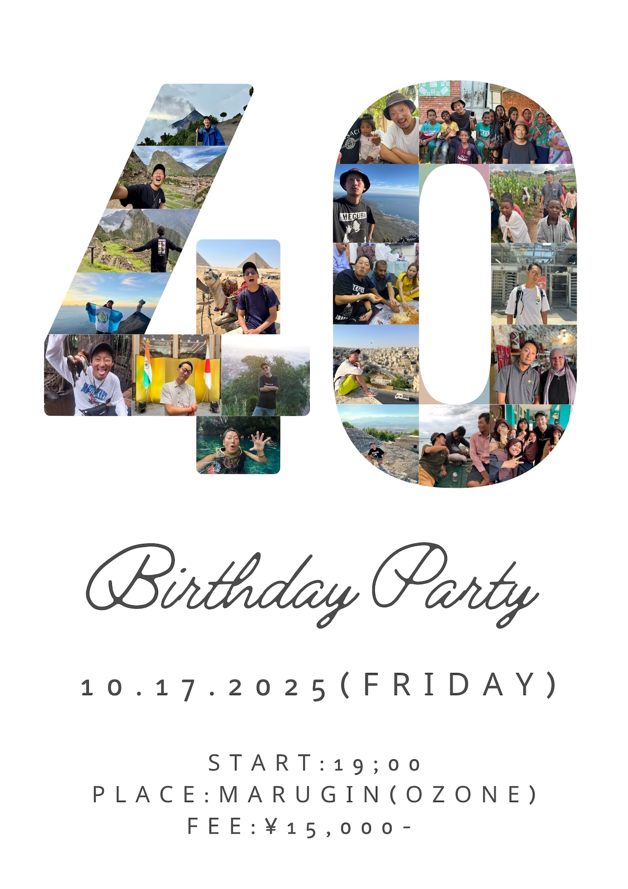 いつも旅先で寂しい誕生日を過ごしてきた僕ですが、今年は記念すべきこの日を、いつも応援してくださる皆さんや、同じ志を持つ仲間たちと直接お会いして、40歳になったばかりの最初の一歩を一緒に踏み出せたらこんなに嬉しいことはありません。